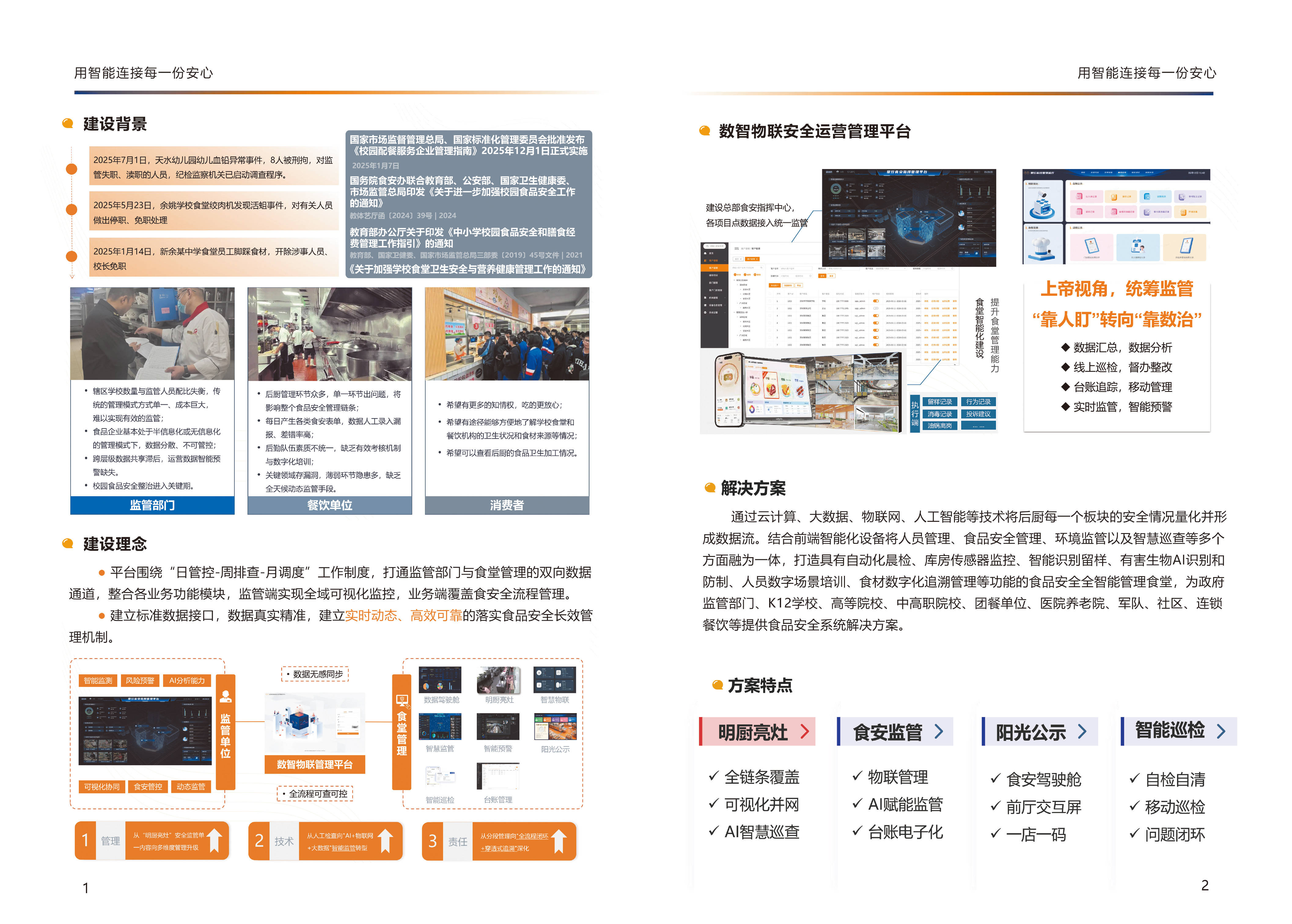 中小学聪慧食堂处理方案具有显著的行业劣势和特点。起首,正在食物平安方面,它能处理保守办理模式下的诸多痛点。保守模式下,辖区学校数量取监管人员配比失衡,办理体例单一、成本庞大,不成管控,跨层级数据共享畅后,运营数据智能预登缺失。而聪慧食堂处理方案能够实现对食材来历、加工过程等全链条的,保障食物平安。例如,通过消息化系统记实食材的采购、运输、储存、加工等环节,一旦呈现问题能够敏捷逃溯。